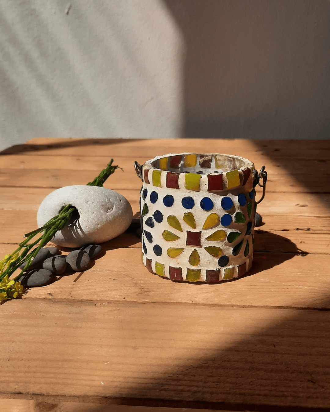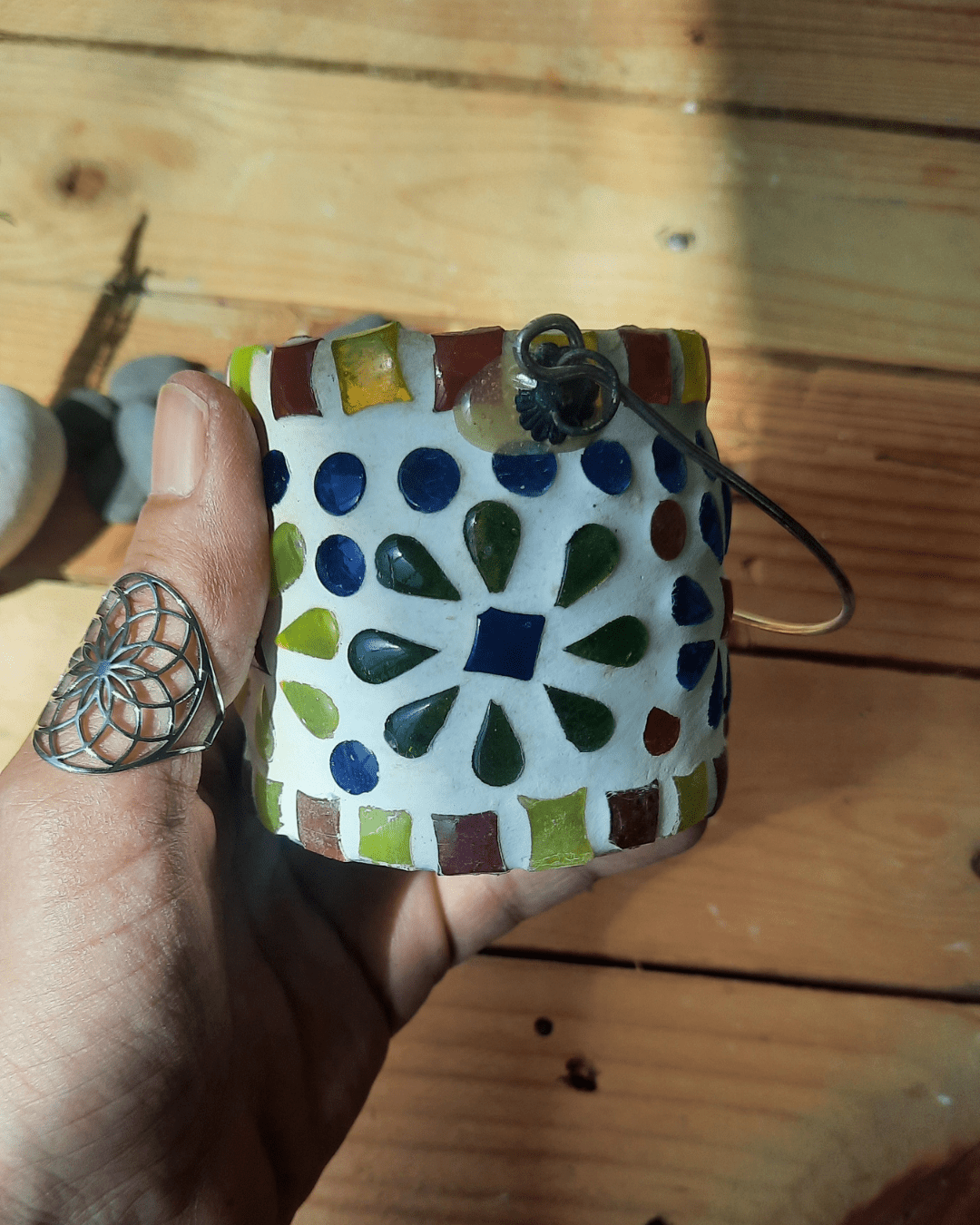 This joyful Festival Glow Lantern is crafted from white clay and adorned with traditional patterns in red, blue, yellow, and green. When lit from within, it transforms your space with tiny, colorful shadows, infusing your ritual or relaxation space with warmth and wonder.
