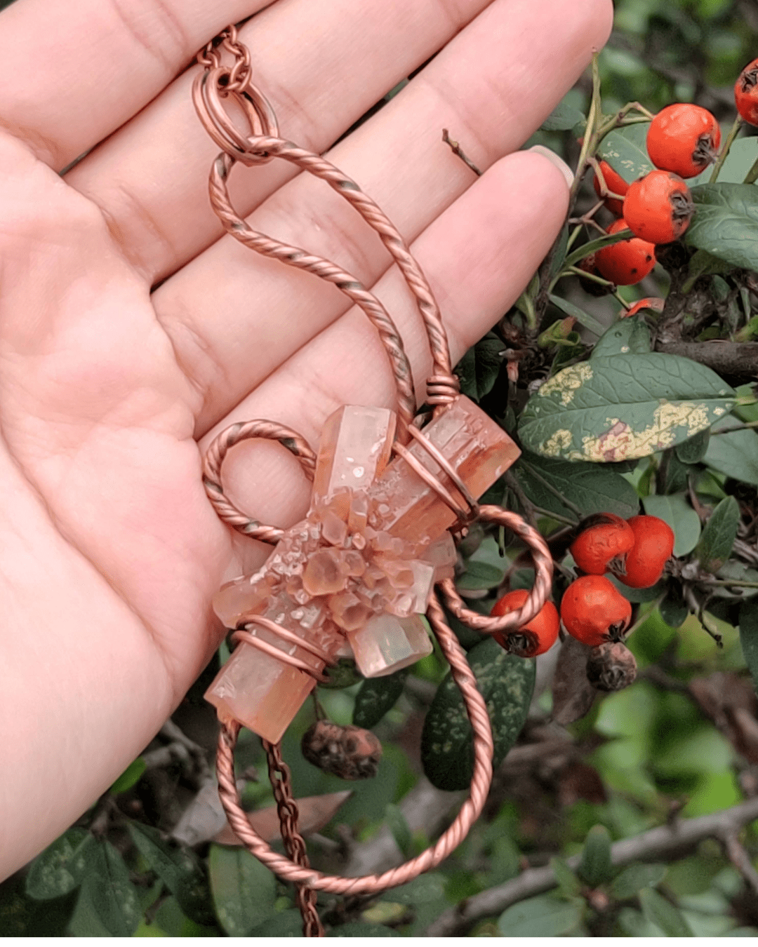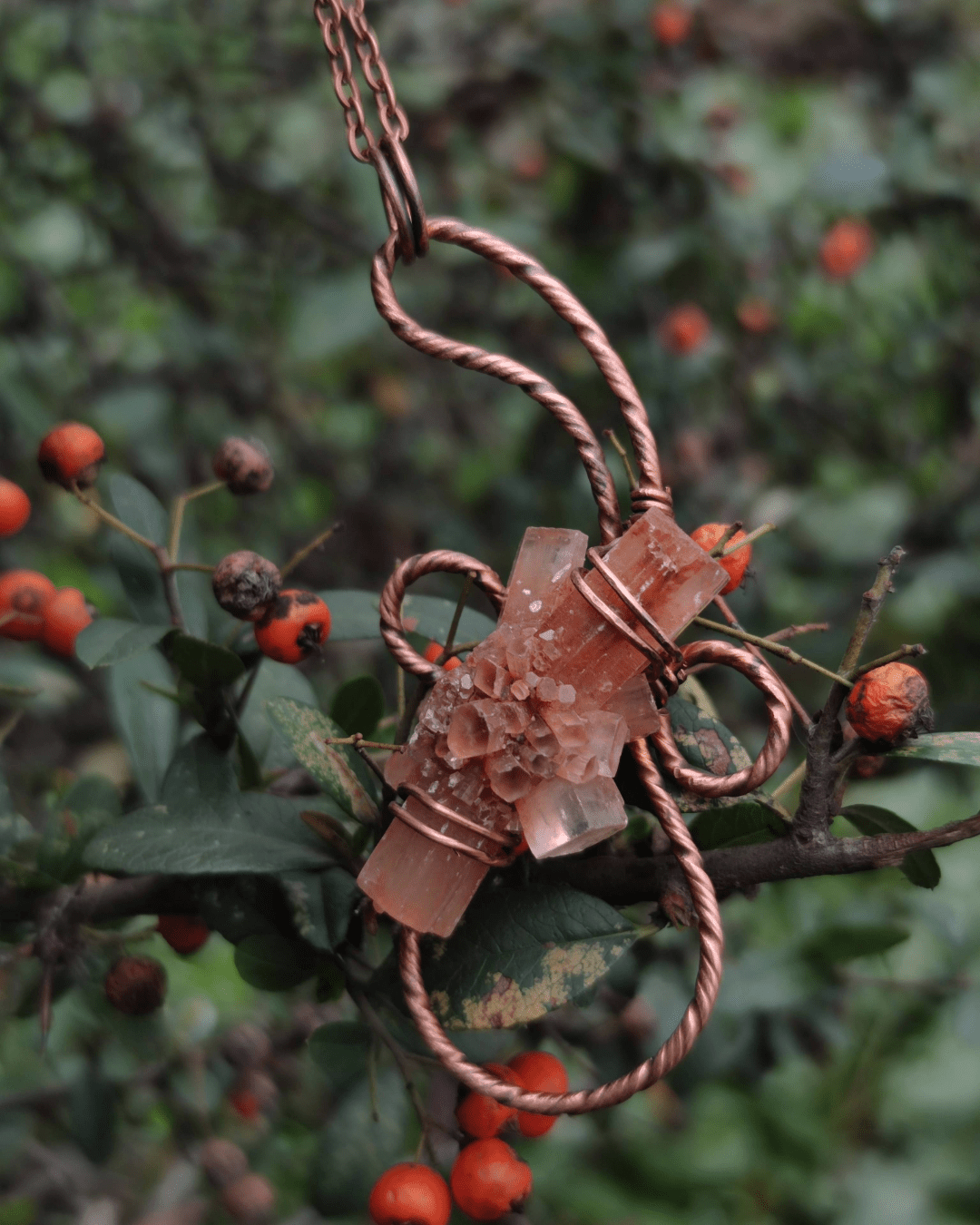 Our enchanting Éclat d’Amour pendant showcases a unique Aragonite stone, wrapped in oxidized copper to amplify its stabilizing and centering energies. This crystal supports us in challenging times by grounding physical energies and preparing our spirit for meditation and growth.