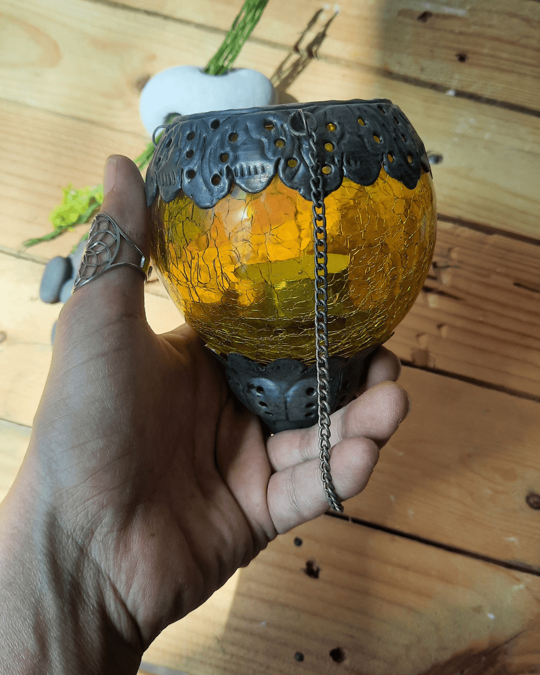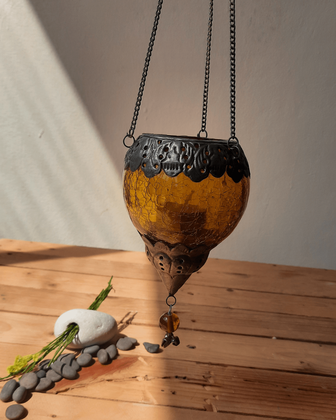 Handcrafted from thick, yellow-tinted glass, the Luminous Hanging Lantern is a radiant piece that merges function with beautiful design. Its gently carved base and warm golden hue invite a soft glow, ideal for illuminating intentional spaces.