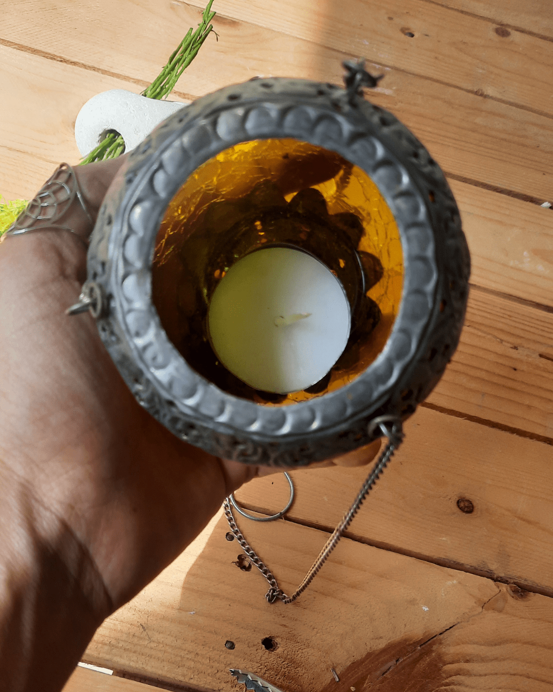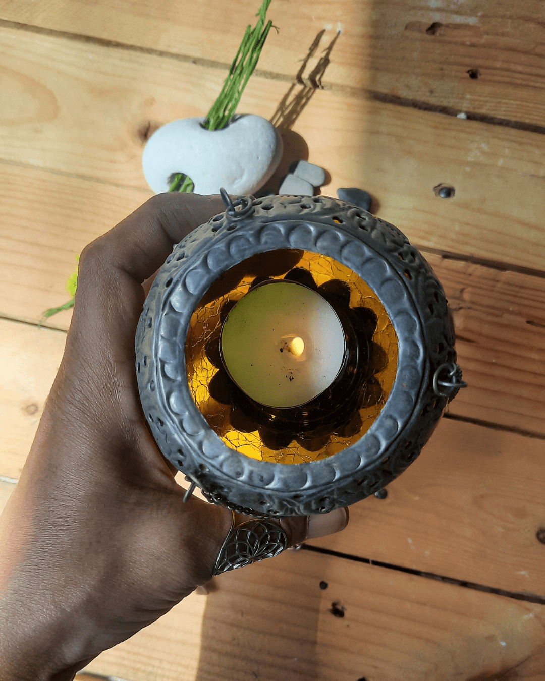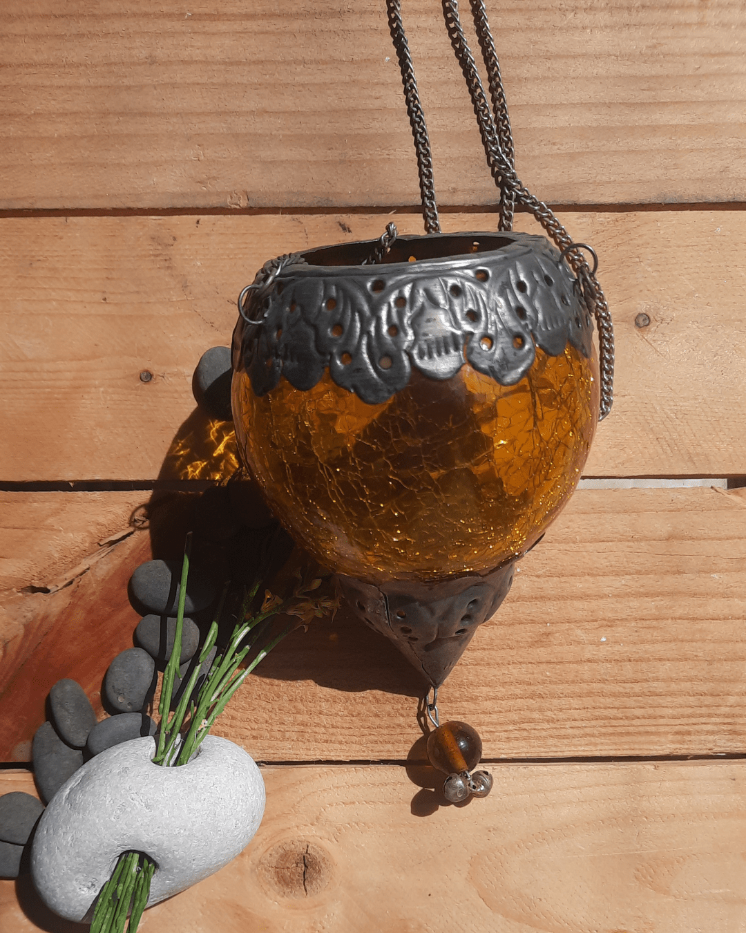 Used to hold a tealight candle or to burn cone incense, this versatile piece brings a soothing ambiance to gardens, patios, or living rooms. Suspended from above, it casts light in gentle waves