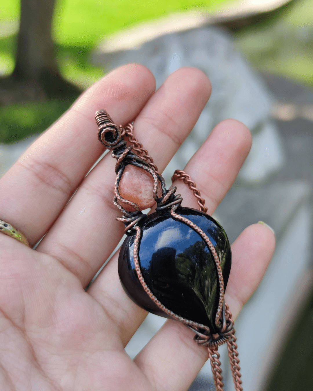 A glowing tribute to the Sun’s warmth and vitality, the Solar Necklace blends the fiery energy of Sunstone with the grounding power of Onyx, all wrapped in oxidized copper and strung on an adjustable strap. This radiant pendant invites you to awaken your inner light while staying rooted and supported.