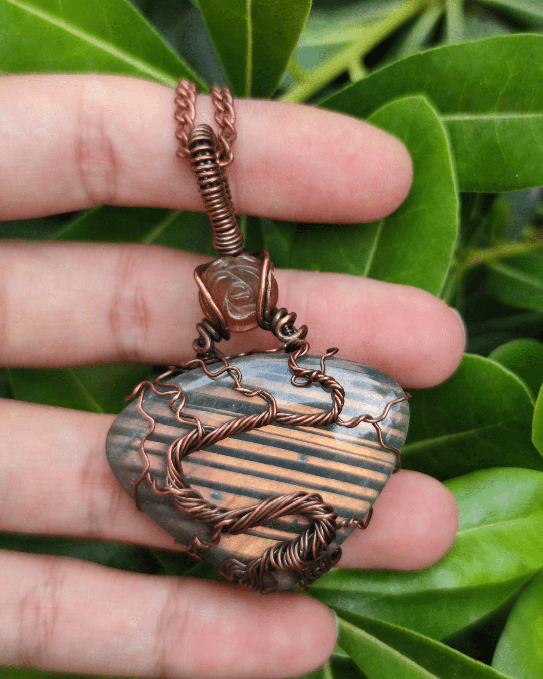 The Tree of Life Necklace is a powerful symbol of growth, rootedness, and inner evolution. This handcrafted pendant features a warm red-brown Agate carved into a flower, paired with a stunning striped Labradorite that flashes with shades of orange and grey. Wrapped in oxidized copper in the sacred Tree of Life motif, this piece connects Earth and Spirit, grounding your energy while guiding your intuition.